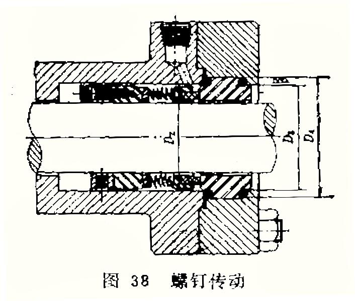 二、螺釘傳動(dòng)(圖38)動(dòng)環(huán)的后部端面鉆有螺釘孔并帶螺紋,軸套上帶有突緣,用螺釘將動(dòng)環(huán)和軸套的突緣聯(lián)按在一起,中心設(shè)墊片避免介質(zhì)沿動(dòng)環(huán)和軸套之間走漏。
