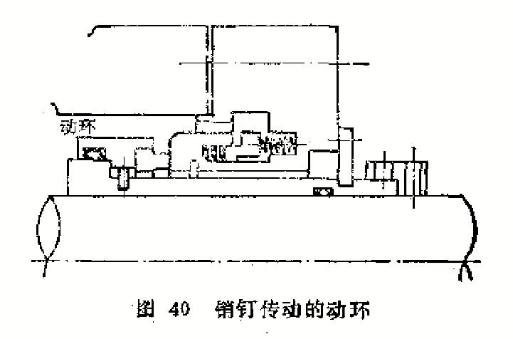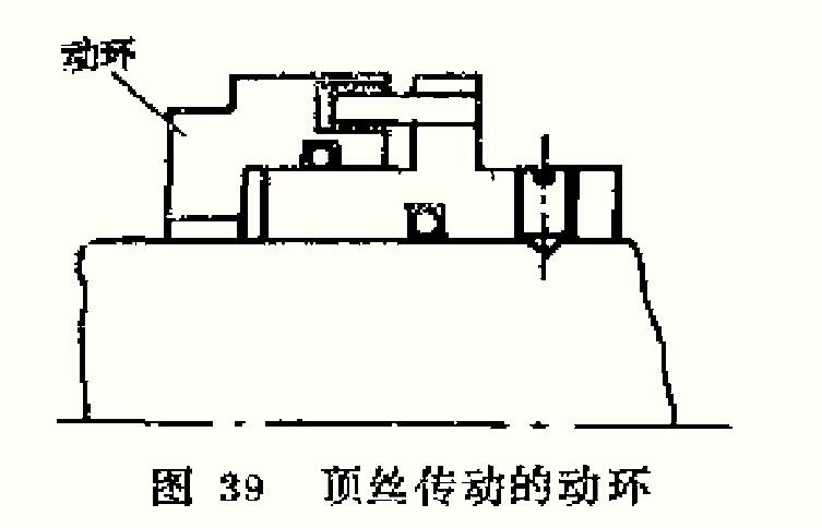 三、頂絲傳動(dòng)(圖39)這種結(jié)構(gòu)實(shí)際上增加了一個(gè)傳動(dòng)套套,該套用頂絲固定在軸上,動(dòng)環(huán)用銷(xiāo)釘與其傳動(dòng),在傳動(dòng)套和軸以及動(dòng)環(huán)和傳動(dòng)套之間均設(shè)有密封圈。這種動(dòng)環(huán)結(jié)構(gòu)較為復(fù)雜,但其起浮性得到了改進(jìn)。