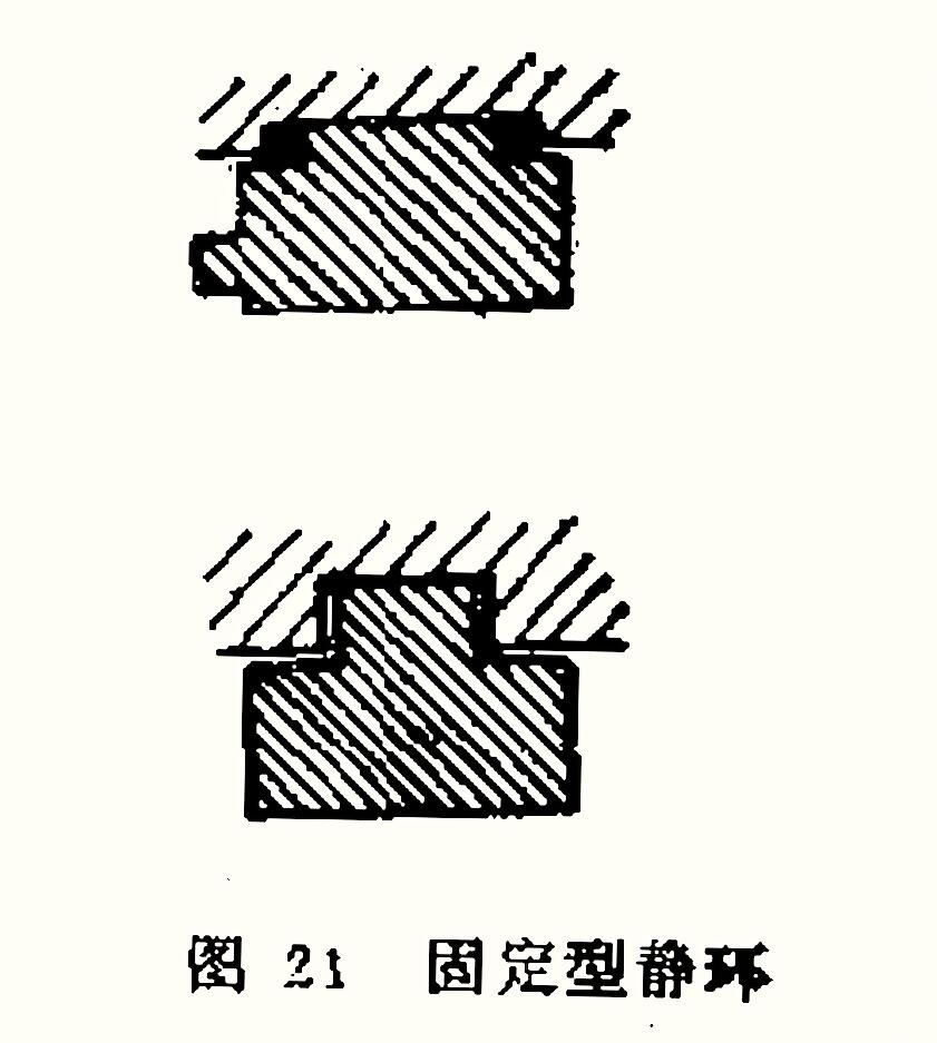 圖21所示為幾種固定型靜環(huán),這種靜環(huán)由于起浮性差,裝置時(shí)尤其要注意密封端面和軸心線的垂直度。其優(yōu)點(diǎn)是泵抽暇時(shí)靜環(huán)不至于離位,較為牢靠。三、粘結(jié)型靜環(huán)
