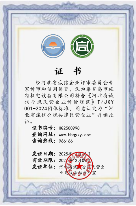 經河北省誠信企業評審委員會專家評審和信用篩查,認定為秦皇島市旅特機電設備有限公司符合《河北省誠信合規民營企業評價規范》T/JXY001-2024團體標準,同意認定為‘’河北省誠信合規共建民營企業”并頒此證。