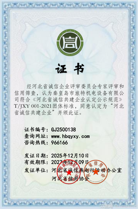 經河北省誠信企業評審委員會專家評審和信用篩查,認定為秦皇島市旅特機電設備有限公司符合《河北省誠信共建企業認定公示規范》T/JXY001-2021團體標準,同意認定為‘’河北省誠信共建企業”并頒此證。此次榮譽的獲得肯定了公司誠信經營促進行業健康發展所做的努力。公司將繼續以“誠信得天下,匠心鑄輝煌”的企業經營理念,不斷提升企業誠信建設工作水平,努力將企業做大做強做優,爭做標桿企業,發揮榜樣作用。
